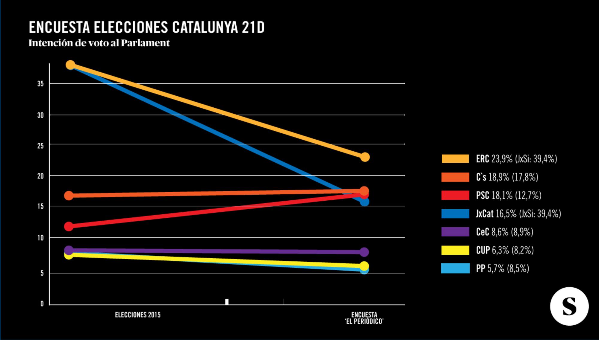 Prosigue el baile de encuestas, y no hay duda sobre quién estará en la cima del podio. El último sondeo publicado sobre las elecciones catalanas del próximo 21 de diciembre da a ERC una clara mayoría, con un 23,9% de los sufragios. La incógnita está en qué formación será la segunda clasificada.
