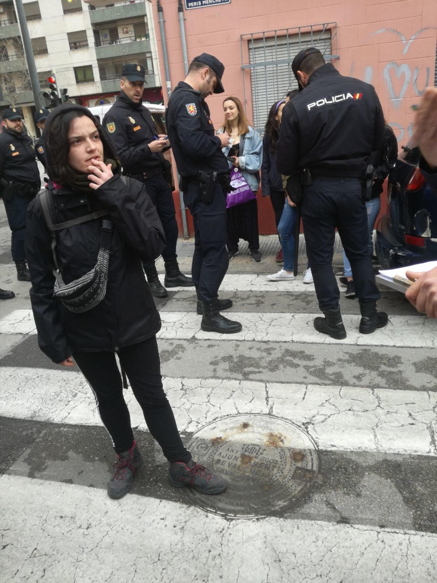 El incidente más desagradable en la mañana de la huelga feminista ha tenido lugar en Valencia. En torno a las 10 de la mañana, y tras estar apostadas unos 20 minutos en la puerta de un Mercadona, la policía nacional ha retenido e identificado a las activistas que participaban en el piquete. Tras unos minutos bloqueadas en la calle Peris Mencheta del barrio de Benimaclet, unas 20 activistas han marchado finalmente sin ser detenidas aunque sin saber si van a ser o no acusadas de alguna falta.