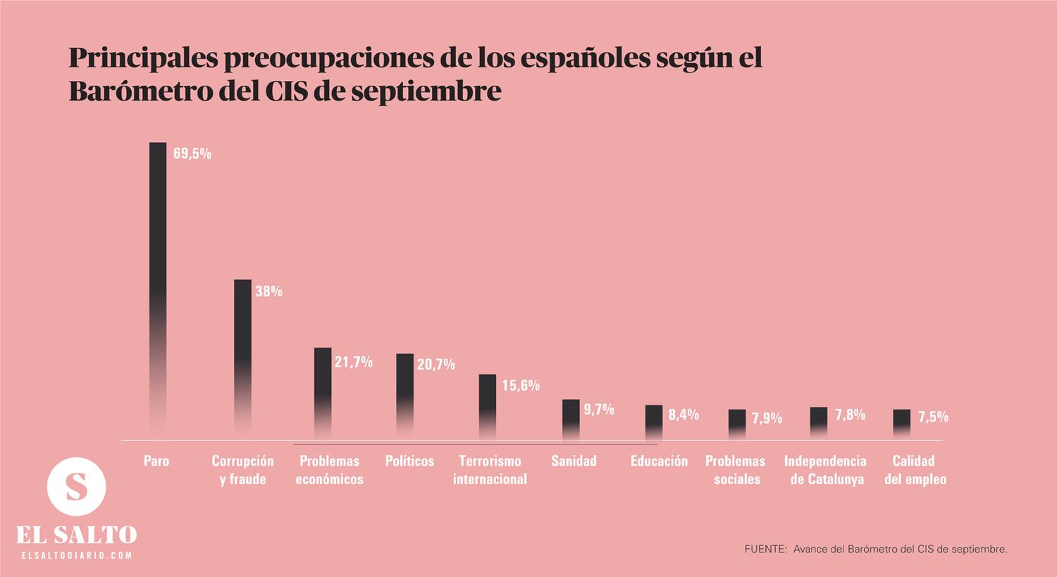 El paro sigue siendo el problema que más quita el sueño, con el 69,5% –tan solo 0,9 puntos menos que los que tuvo en el CIS de julio–, seguido por el fraude y la corrupción, con el 38% –7,3 puntos menos que en julio–, los problemas de índole económica –que pasan del 19,8% al 21,7%– y los políticos en general –que pasa del 21,8% al 20,7%–.