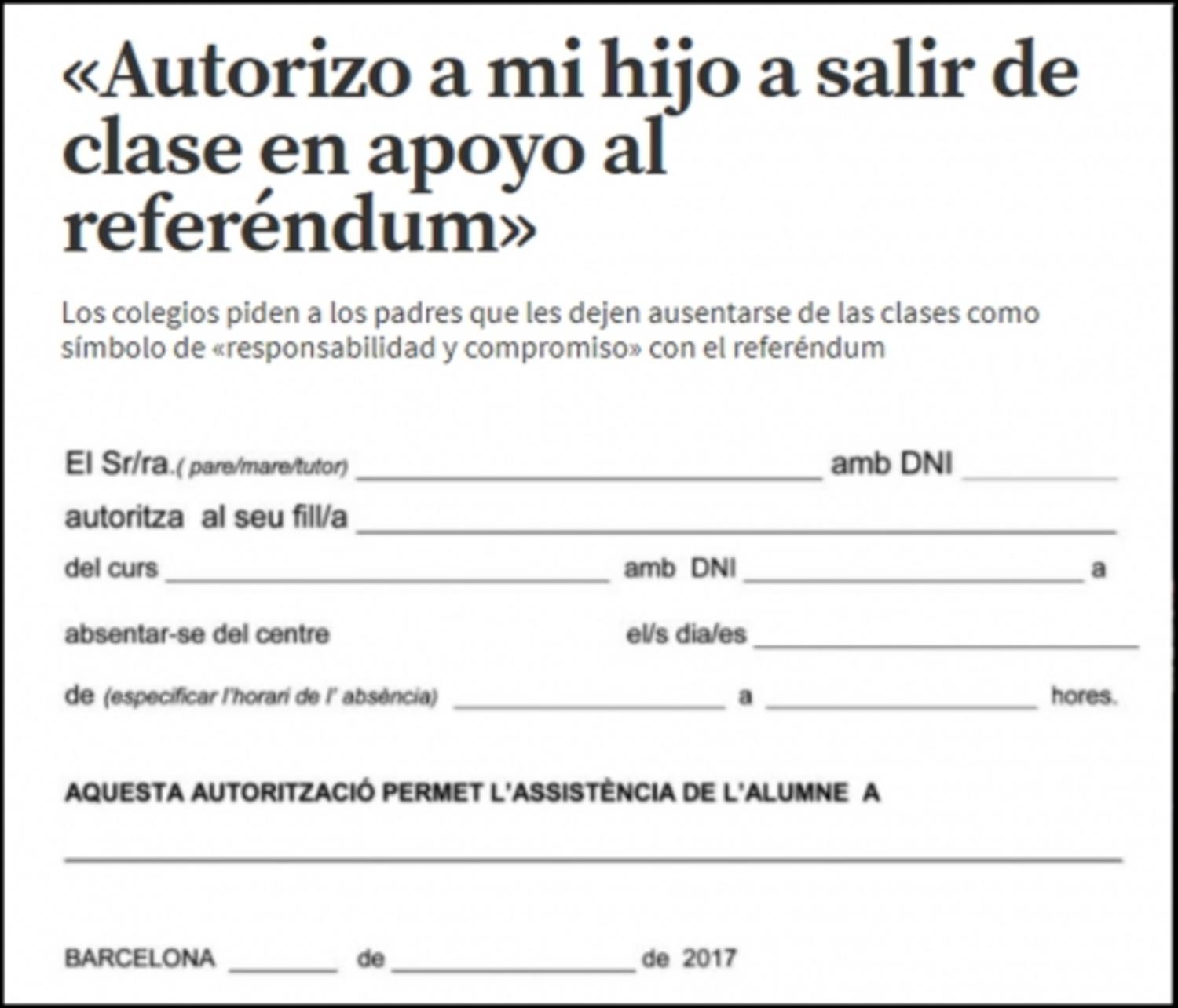 El Mundo, el 26 de septiembre, lo resumía con un titular del todo elocuente: "Niños de la inmersión, fábrica de patriotas". La información que la acompaña hace un repaso histórico a las políticas lingüísticas desarrolladas por la Generalitat autonómica hasta llegar a la situación actual, para acabar concluyendo que "detrás de los niños de Olot, de los adolescentes que estos días faltan a clase para ir a pegar carteles por el 1-O, de esos críos que se manifiestan con esteladas anudadas al cuello, existe todo un proyecto que ha ido expandiéndose mientras los sucesivos Gobiernos de la nación –también los del PP– hacían como que no se enteraban". Los "niños de Olot" serían los alumnos de un instituto de la capital de la Garrotxa que habría dirigido una petición a las familias para autorizar a sus hijas a no dar clase por una movilización en defensa del referéndum. El mismo diario lo elevó a la categoría de noticia, a pesar de partir de unos boletines sin firma (filtrados, de nuevo, por Sociedad Civil Catalana) y cuya información no se ha contrastado con el centro escolar que, de hecho, no se dice cuál es. Días después, el 27 de septiembre, La Razón insistía en la idea de los permisos para hacer campaña en defensa del 1-O, igualmente de forma genérica y con unos boletines en blanco que no llevan el sello de ningún centro ni el motivo del permiso.