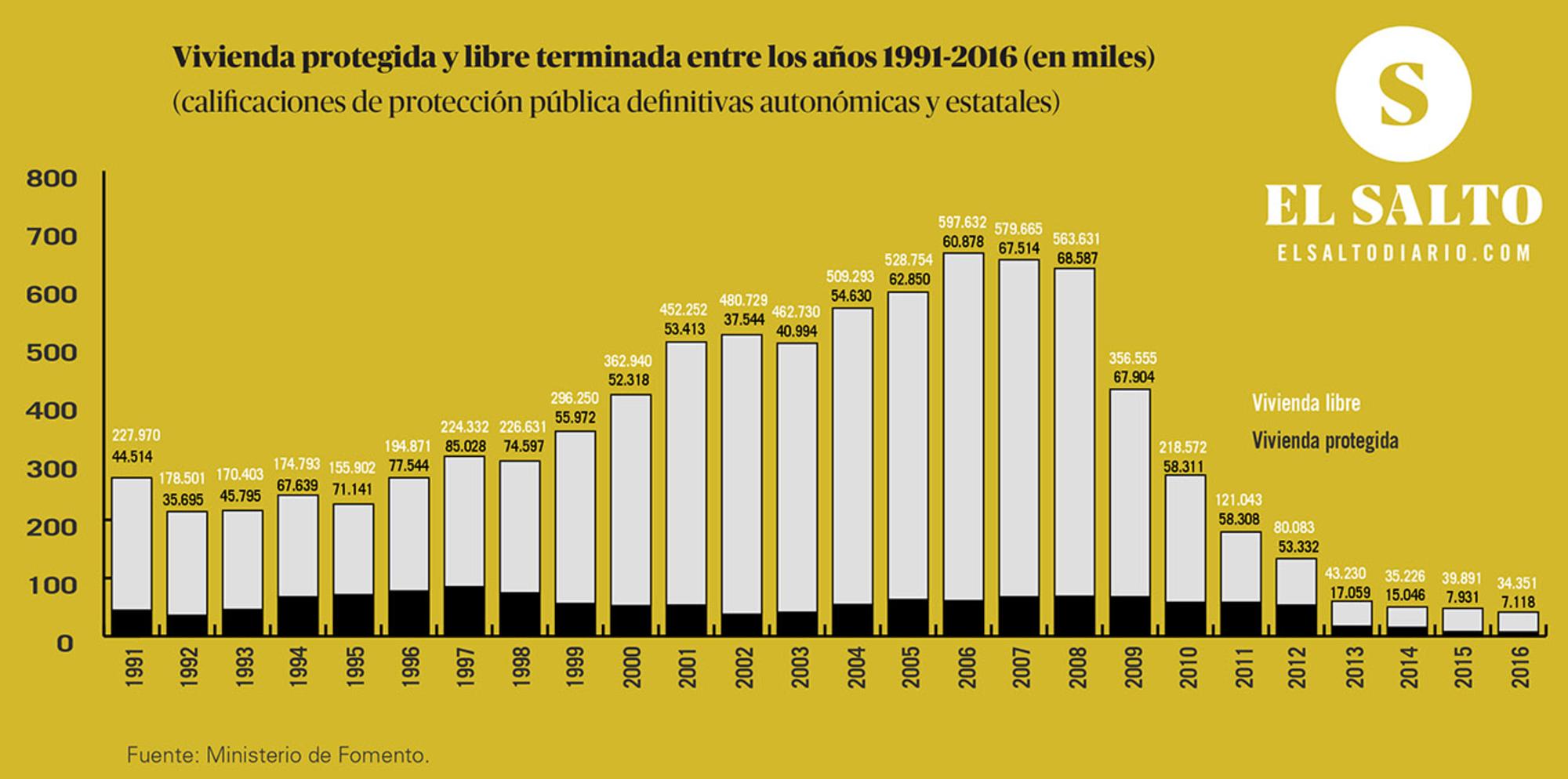 Las administraciones españolas nunca han apostado por la creación de un parque público de viviendas en alquiler a precios inferiores a los del mercado. De las viviendas construidas en el periodo 2005-2016, solo un escaso 3% era vivienda protegida dirigida al alquiler. Es ahí donde está el meollo de la cuestión.