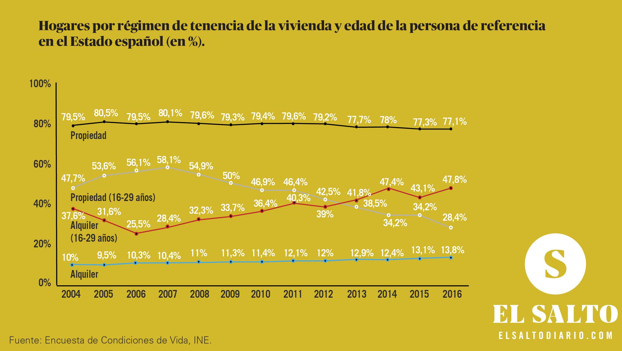 Sin embargo, en una sociedad post-crisis en la que el grifo de acceso al crédito hipotecario se ha cerrado para muchos y los salarios han caído, el alquiler pasa a ser la única forma que tienen los jóvenes, y cada vez más personas adultas, de acceder a una vivienda. "A esto se le suma vencimiento de muchos contratos: los de cinco años de duración de la antigua Ley de Arrendamientos Urbanos, y los de tres de la nueva. Es decir, más gente buscando a la vez y más propietarios actualizando el precio", explica Álvaro Ardura, urbanista y coautor del libro First We Take Manhattan (Catarata, 2016).