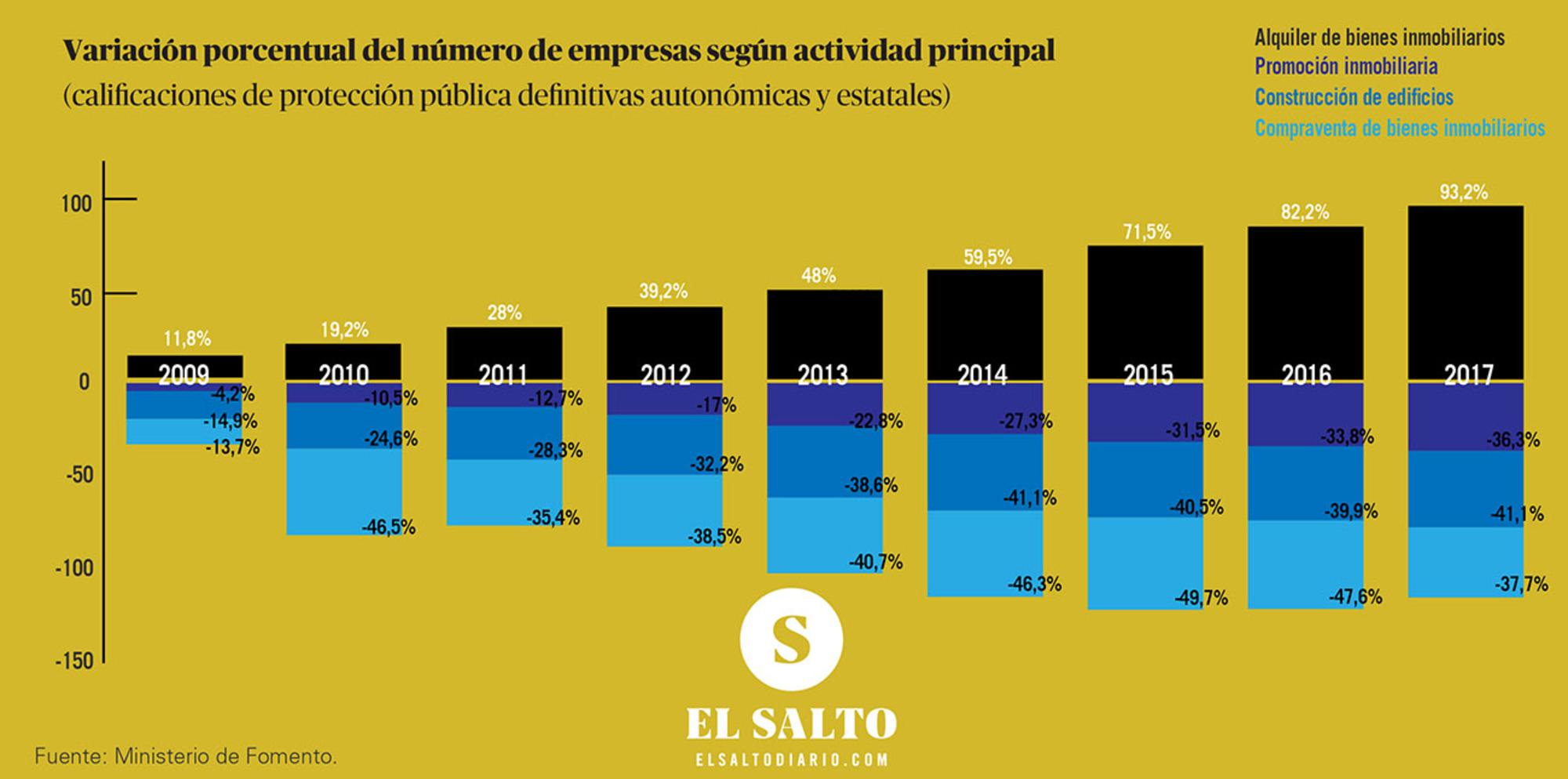 Recientemente, también Santander, BBVA, y Acciona se han sumado al negocio de las SOCIMIS, una figura de inversión inmobiliaria con elevados incentivos fiscales. Y esto tienen consecuencias: “Un parque de alquiler privado controlado por unos pocos actores sin contraparte pública es un escenario muy malo”, defiende Ardura.