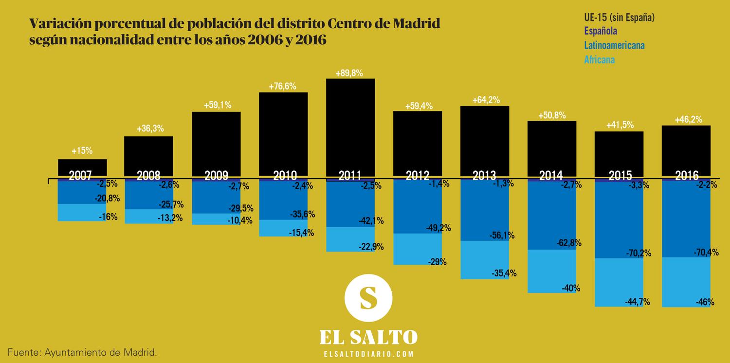 Según datos del Ayuntamiento de Madrid, en el distrito Centro se observa una reducción drástica de la población nacida en países latinoamericanos y africanos, y un aumento de ciudadanos nacidos en países de la Unión Europea. En 2012, la renta media de los extracomunitarios en Madrid era de 14.346 euros anuales frente a los 37.625 de los extranjeros que provenían de países miembro de la Unión Europea.