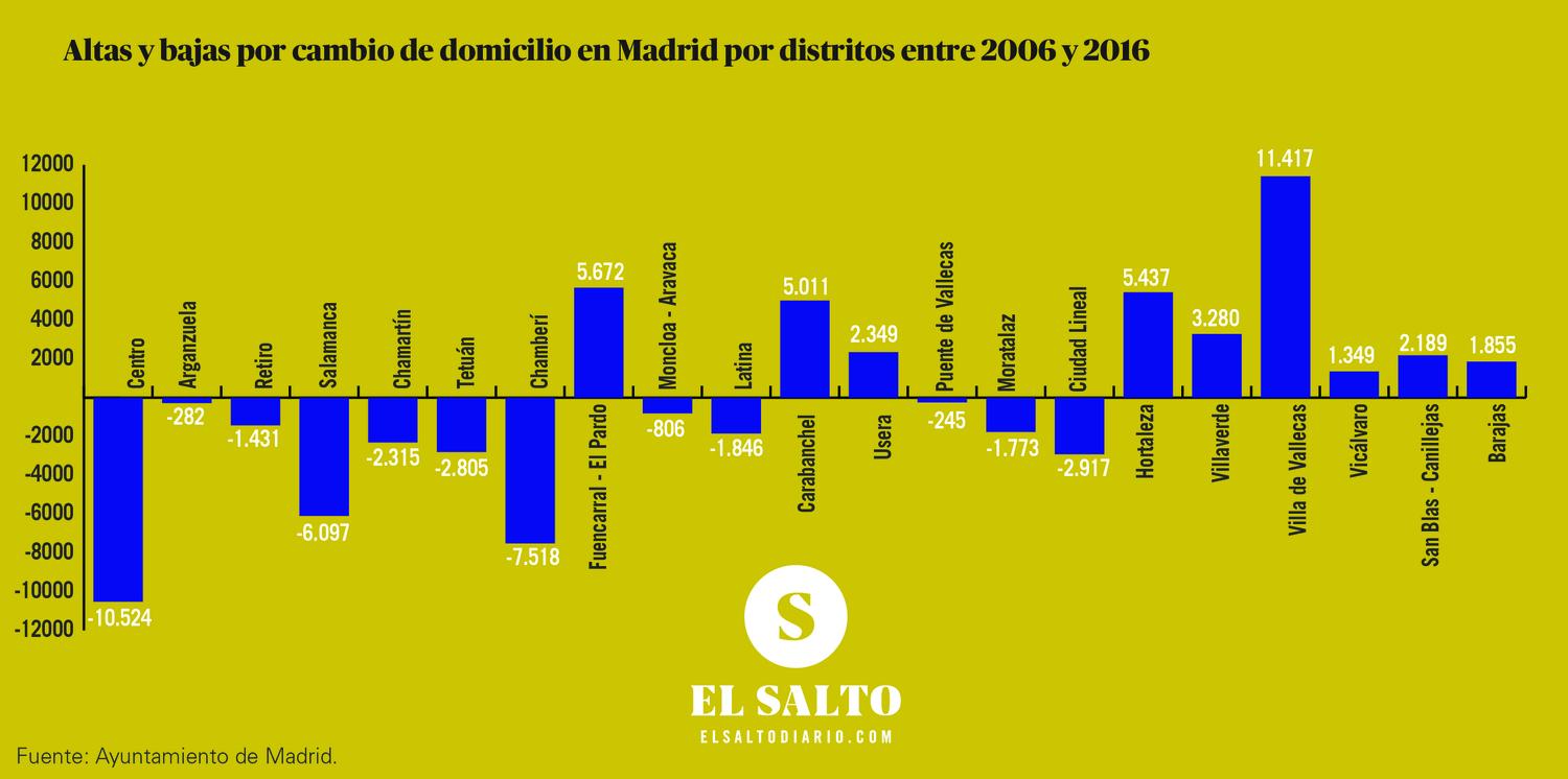 Existe una dinámica común a todos los centros urbanos de las grandes ciudades españolas: tras épocas de decadencia urbana, la destrucción creativa de la ciudad deja paso al renacimiento de los barrios céntricos. Pero de este proceso se derivan algunos costes nada menores: suben los precios de la vivienda, cambian los comercios, unos vecinos se ven obligados a irse y otros les sustituyen. Se llama gentrificación, y las cupcakes son solo el final del proceso.Si consideramos los datos de altas y bajas por cambio de domicilio dentro de la ciudad de Madrid en la última década, llama la atención el desplazamiento sostenido desde los distritos del centro hacia los periféricos. En términos globales, la población de los distritos de Centro y Chamberí ha disminuido en 30.973 habitantes, mientras que la de distritos periféricos como Villa de Vallecas y Fuencarral-El Pardo ha aumentado en 66.873.