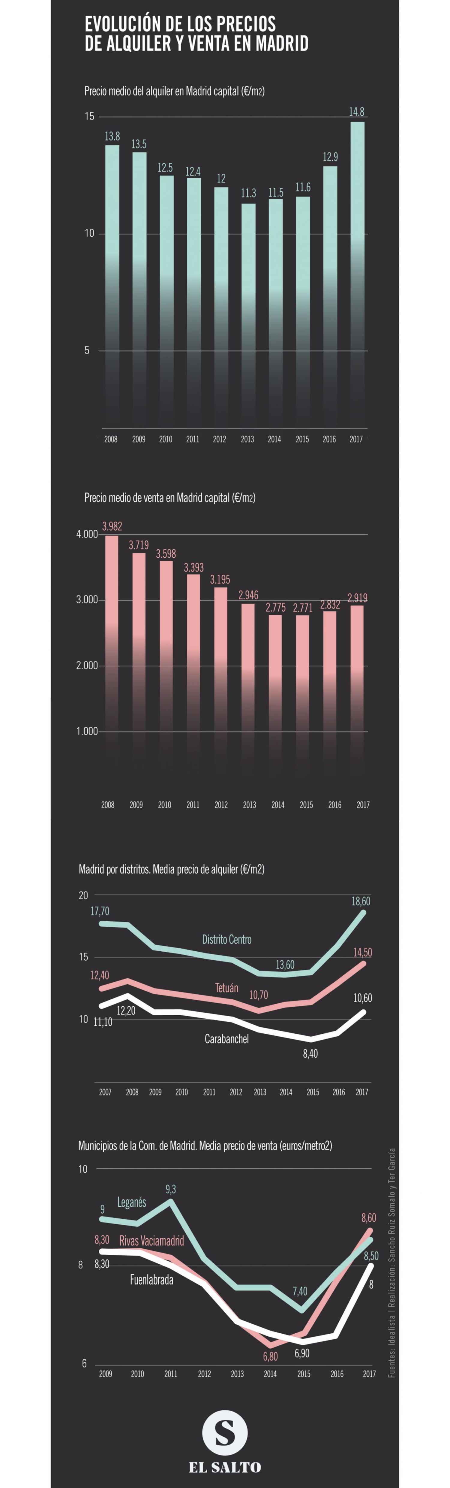 Según datos del Consejo General del Poder Judicial, en el tercer trimestre de 2016 los de alquiler ya eran el 55,1% de los desahucios a nivel estatal. En el caso de Madrid, el 72,7% —970 de los 1.333—. “Hay muchos casos que ni siquiera quedan registrados, al no iniciarse demanda. Mucha gente se va de buenas con el casero”, explica un portavoz de PAH Vallecas, que alerta de que en estos meses están llegando a su fin los miles de contratos de alquiler social firmados tras la explosión de desahucios hipotecarios de 2012.El caso de Alicia es uno de ellos. “A mí me desahuciaron en 2012”, explica a El Salto. Después de quedarse con una deuda de 140.000 euros —del total de 260.000 de su hipoteca—, Alicia acudió a la PAH de Usera. Antes había pedido ayuda a los Servicios Sociales del Ayuntamiento, que le ofrecieron pasar unos días en un albergue, y estuvo unos meses en un piso alquilado por 700 euros. “Mi nómina es de 700 euros —trabajando en ayuda a domicilio de personas mayores—, pero en ese momento mi hijo trabajaba y mi hija también hacía pequeños trabajos”. A través de la PAH consiguió, un año después, que Deutsche Bank, la entidad con la que tenía contratada la hipoteca, le dejara en régimen de alquiler social —por 400 euros mensuales— el mismo piso del que la había desahuciado —que se encontró sin calefactores ni puertas— y por el que siguió pagando letras de 800 euros hasta que el banco lo subastó. El nuevo propietario del piso, el fondo de inversión Placerville Invest —administrado por Belén Garrigues, quien acompañó a Sheldon Adelson en su intentona de Eurovegas de 2014—, le exige que abandone su vivienda antes de que acabe mayo. “He pedido ayuda a la EMVS, al IVIMA, a Servicios Sociales, y dicen que no tienen pisos para mi caso. El Deutsche Bank dice que ha vendido todo el paquete, y yo no puedo alquilarme un piso del mercado porque no llego”. Si volvemos a los anuncios y esta vez buscamos por Usera, los resultados no son muy distintos de los ya expuestos. En Idealista tan solo había tres anuncios de pisos por 500 euros mensuales o —algo— menos, dos de ellos de una habitación. El piso más barato de tres habitaciones costaba 650 euros.