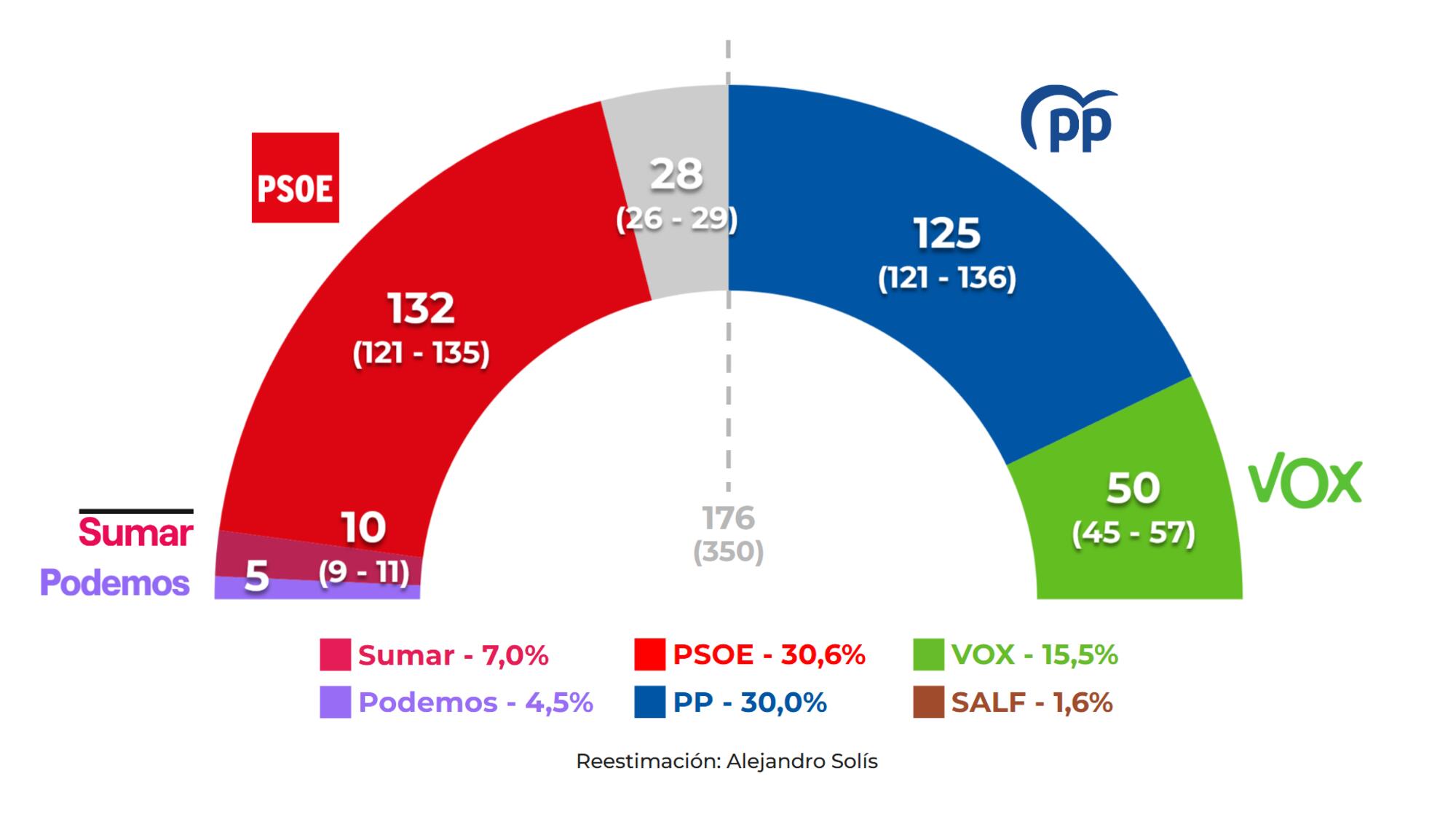 Por otro lado, la situación del PSOE no ha mejorado especialmente. Aunque es cierto que se han convertido en el partido con el electorado más fiel —y de ahí su robustez en torno al 30% de los votos— no están sabiendo movilizar al resto de votantes ni captar a los votantes descontentos con Sumar y Podemos, que no se van al PSOE, sino a la abstención. De ahí la igualdad entre el PP y el PSOE. Ambos en el entorno del 30% de los votos y con una horquilla de escaños que oscila entre los 120 y los 135 escaños.