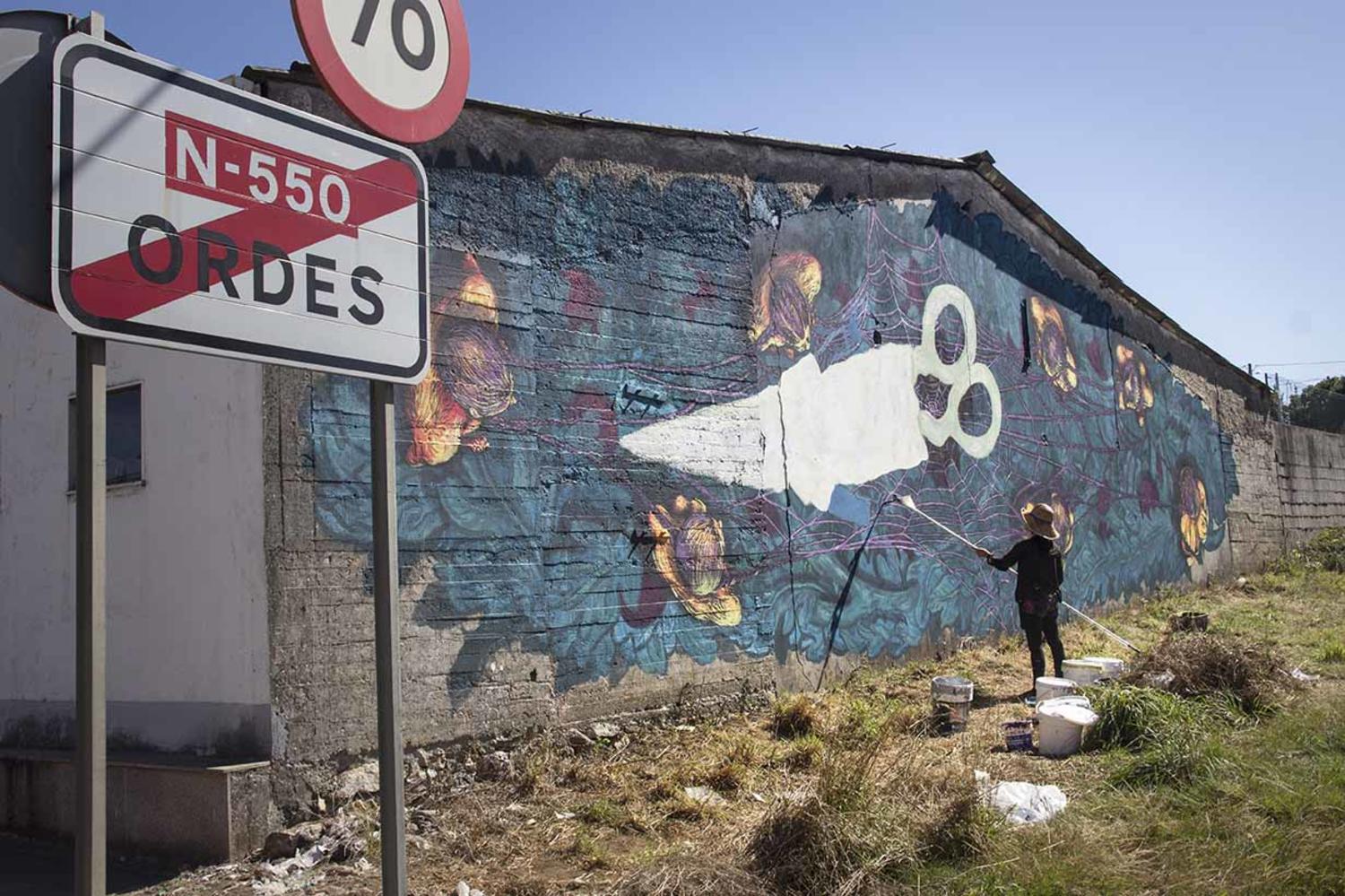 Esta artista colombiana moi recoñecida no circuíto da arte urbana e o muralismo elixiu desenvolver a súa actividade no anonimato, pero falou co Salto Galiza da obra que deixa en Ordes. “Desbotei pintar algo dixerible ou para todas as idades e tratei o asunto como unha tea de araña invisible que conecta moitas problemáticas. O feminicidio non sinala unicamente a violencia contra as mulleres, tamén apunta os homes e sociedades distraídas que asumen roles ríxidos, castrantes, con futuro programado. Con esa imaxe pregunto que relación teñen o capitalismo, o colonialismo e o poder cos asasinatos selectivos de mulleres, e tamén quero destacar esas redes invisibles pero resistentes de mulleres que no campo ou na investigación enfrontan esa confusión e debilitan os poderes co esforzo do cambio, do estudo e da solidariedade”.