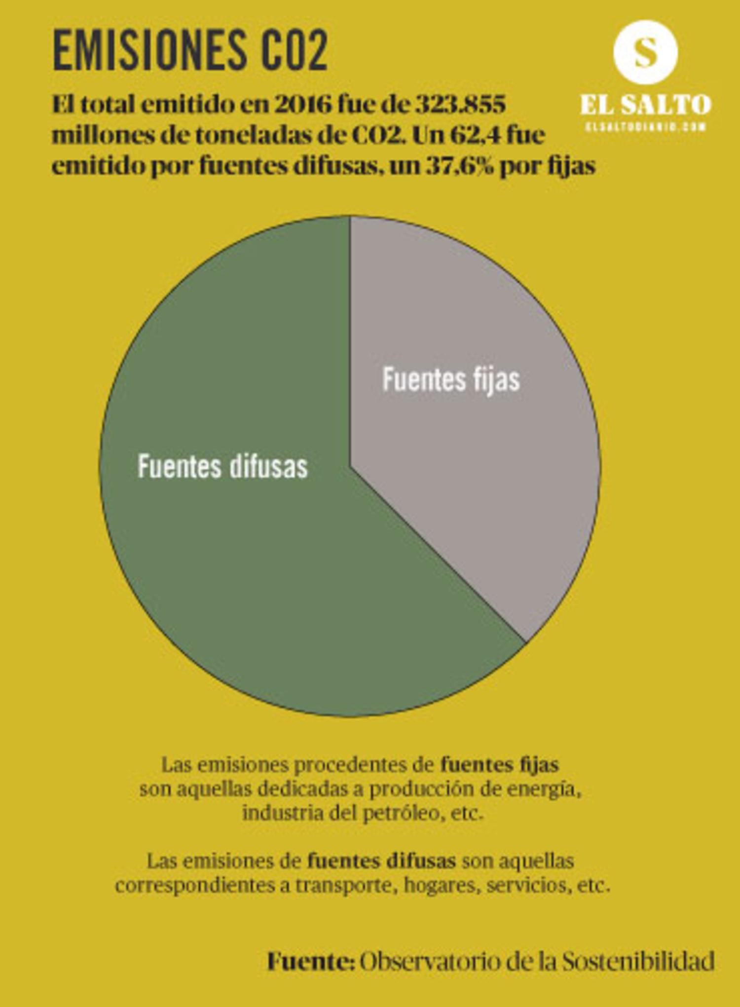 El documento analiza las emisiones procedentes de fuentes fijas incluidas en el Registro Nacional de Derechos de Emisión de Gases de Efecto Invernadero (Renade) en el año 2016. Estas suponen el 37,6% del total del dióxido de carbono (CO2) emitido a la atmósfera –123,5 millones de toneladas–, procedente básicamente de la industria y el sector energético. El 62,4% restante corresponden a fuentes de emisión de las llamadas “difusas”, entre las que se encuentra el transporte, los servicios, la agricultura o los hogares.