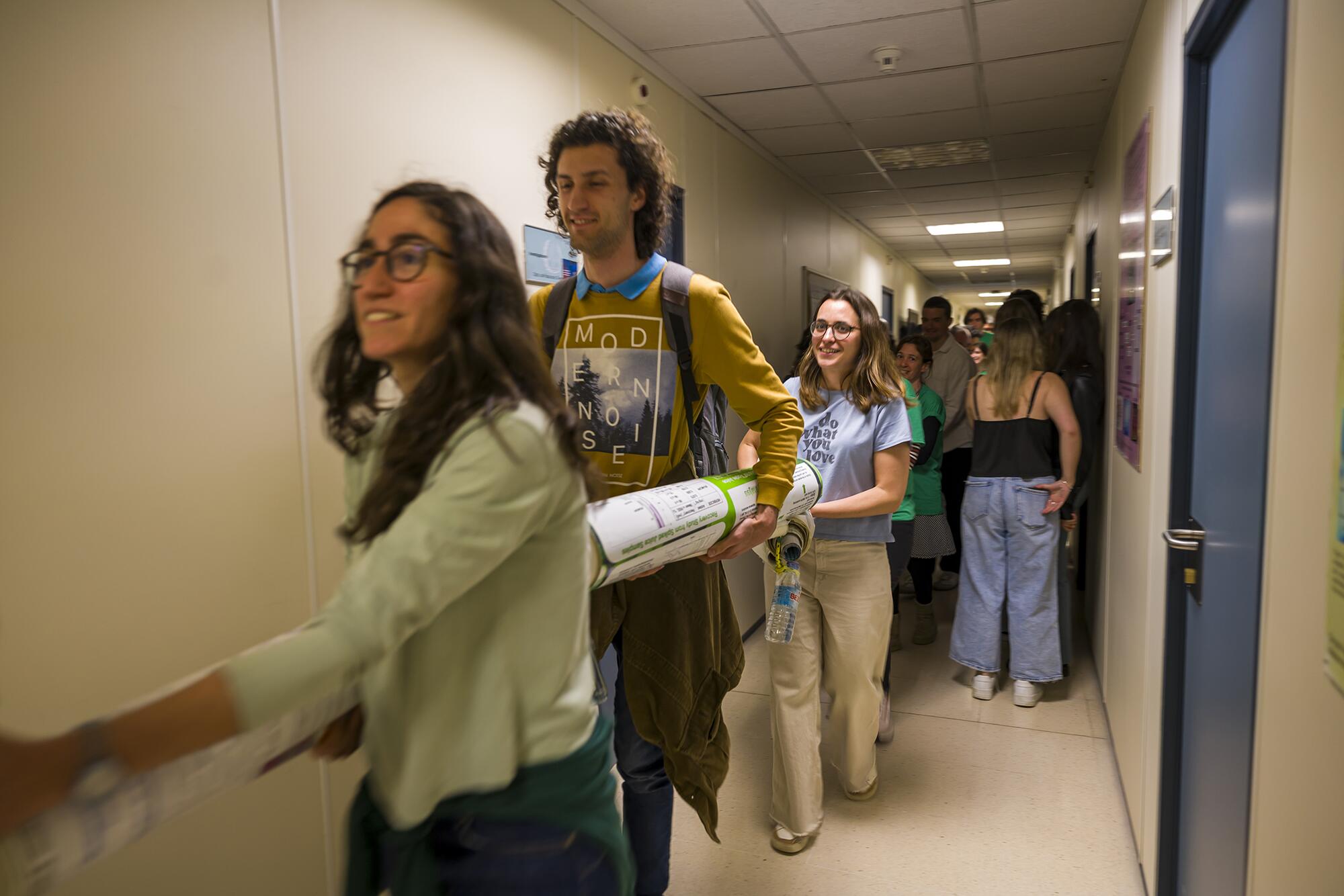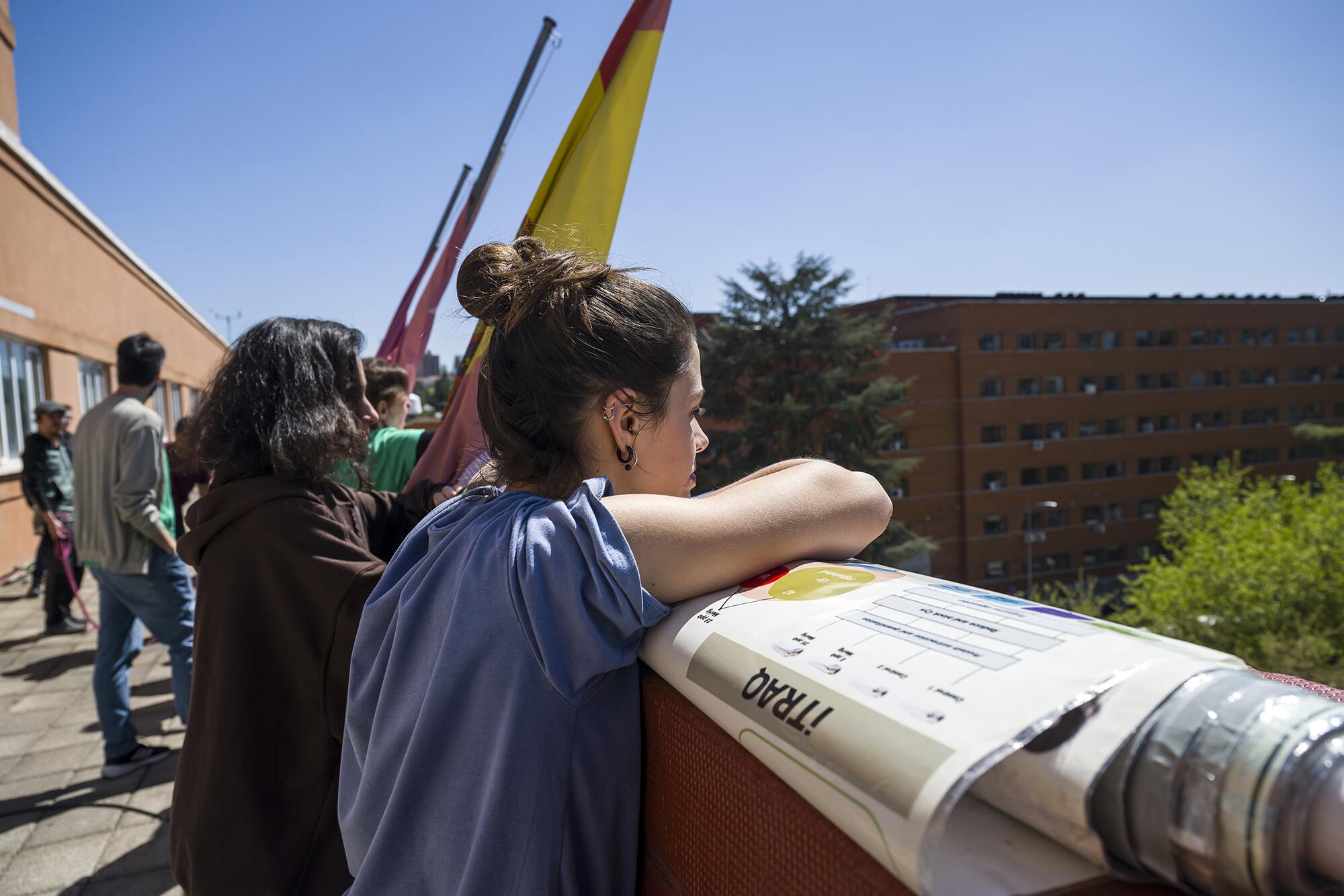 Docentes y estudiantado han desplegado un enorme mural que ha cubierto la fachada de la Facultad de Ciencias Físicas de la Universidad Complutense (UCM), del campus de Moncloa, como parte de las acciones previas a la huelga universitaria convocada para el próximo lunes 28 de abril. Sobre el desplegado, confeccionado con más de 400 carteles de investigación presentados en congresos científicos, se podía leer la principal reivindicación: 'Universidad pública, inversión en calidad'.