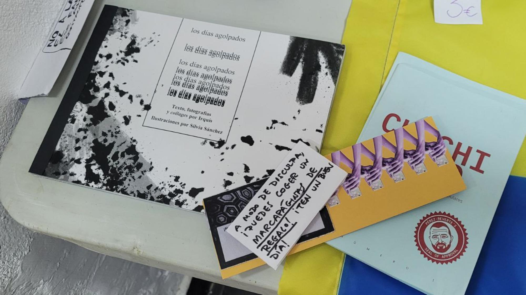 En Sublima también nos damos cuenta de cómo funciona el festival. “Hola, soy uno de los autores de este fanzine de aquí, ¿os importa si recoloco estas cosas para que se vea todo mejor? Pregunta tímidamente Irquís, a lo que María le responde “ponlo como a ti te gustaría verlo”. Irquís (@haljyem) ha escrito un poemario que mezcla situaciones cotidianas con poemas de amor, pero nos explica que solo le ha dado tiempo de encuadernar uno. A modo de disculpa ha confeccionado unos marcapáginas gratuitos que se pueden encontrar junto a su ejemplar.