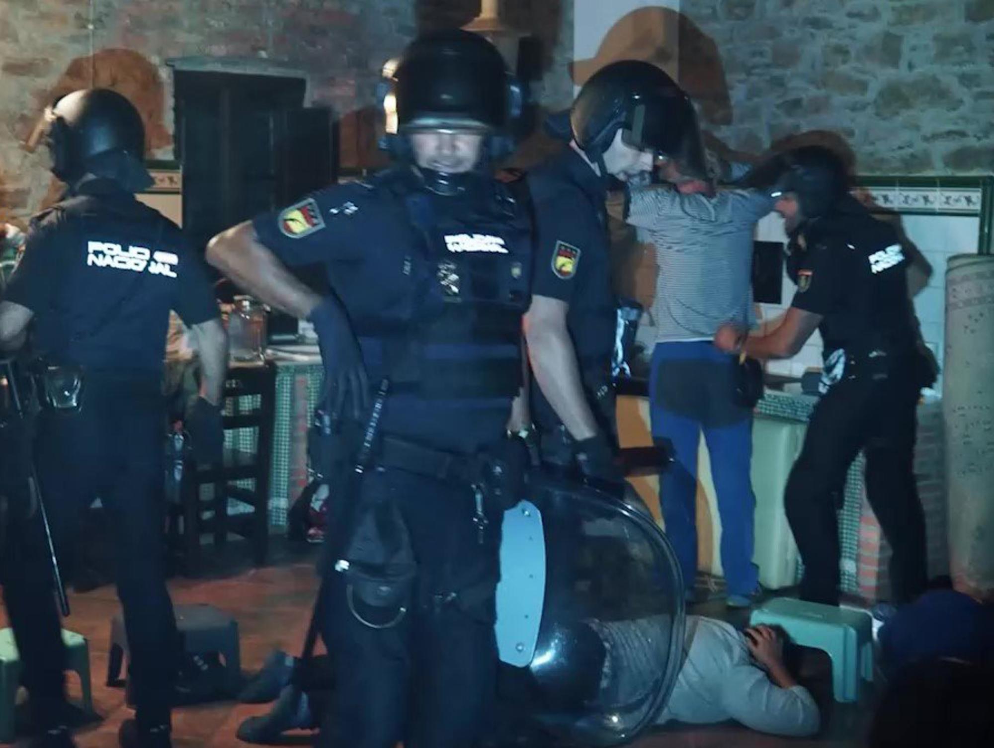 Mientras en el salón se preparaban para la sesión ritual, varias lecheras de la Nacional aparcaban junto a las piscinas. Casi medio centenar de agentes cubren a pie el trecho entre el parking y la finca, como se puede ver en el vídeo que la Policía Nacional compartió en su cuenta oficial de Twitter. Todos con el casco puesto, con escudo y con el ariete preparado.