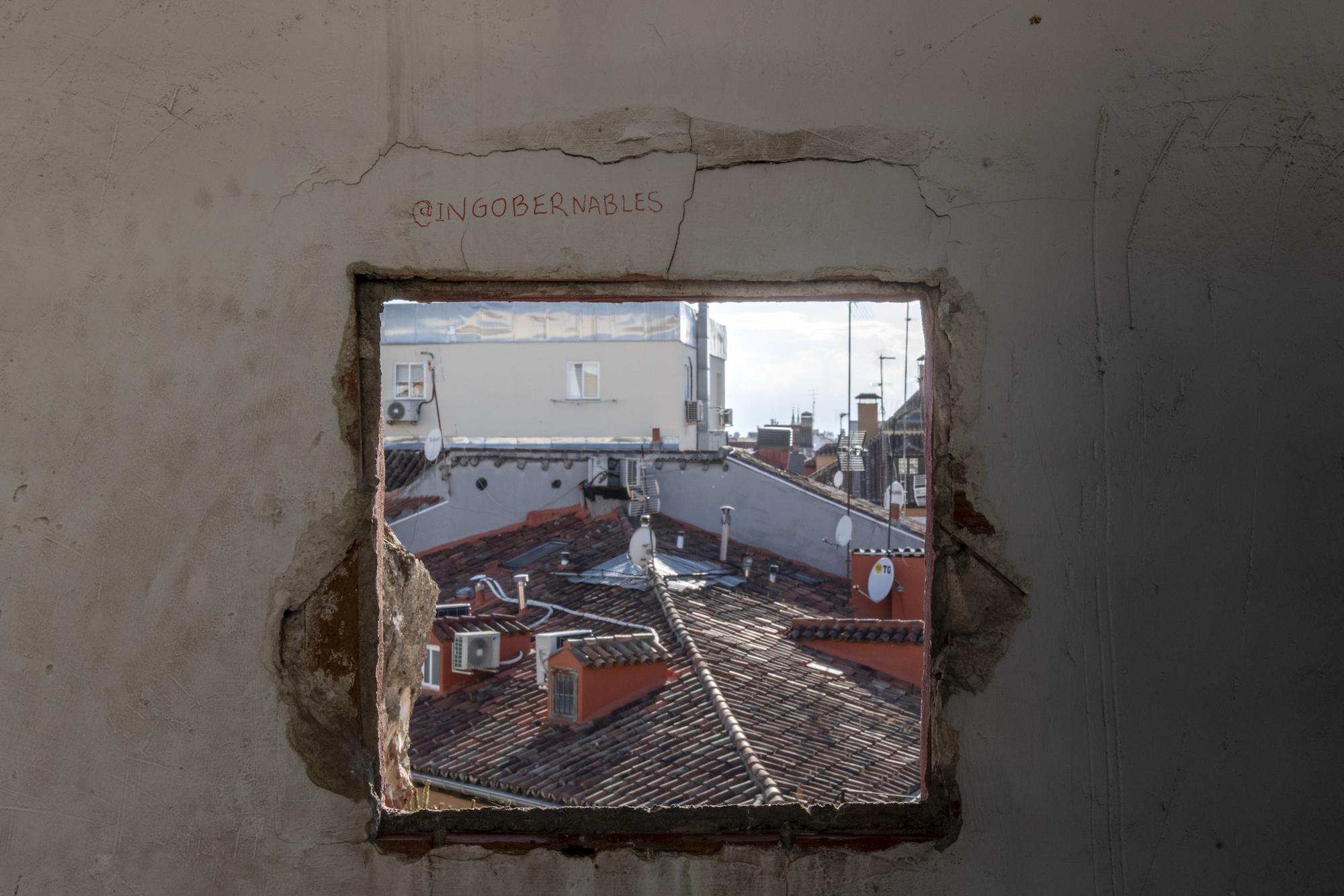 Cuatro plantas, más de 2.000 metros cuadrados, unas 120 habitaciones. Vacías. Llenas de polvo, con algún techo caído, sin gente, sin vida. Justo detrás, otro edificio vacío. Con peor pinta todavía, es un estado lamentable y con unas telas asfálticas intentando cubrir un techo destrozado para que no se filtre el agua, pero que no parece tener mucho éxito. Justo enfrente, encima de una de esas ajetreadas terrazas de cuatro euros la cerveza, otra planta entera con las ventanas tapiadas. Todo ello en el Madrid de la gentrificación, de las familias desahuciadas sin alternativa habitacional, en el centro que expulsa a sus habitantes y a tan solo metros de varias plazas donde cada noche duermen decenas de personas que no tienen un techo.