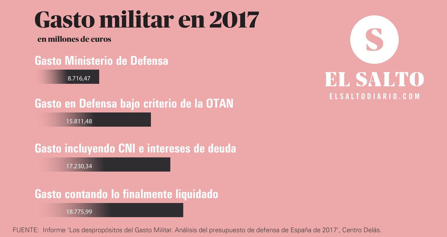 El gasto militar este año ha ascendido a 18.776 millones de euros, según expone un informe elaborado por el Centro Delás de Estudios por la Paz. La cifra supone un 32% que la registrada en 2016 y un 1,64% del PIB –muy por encima del 1% que afirma la ministra de Defensa, María Dolores de Cospedal–.