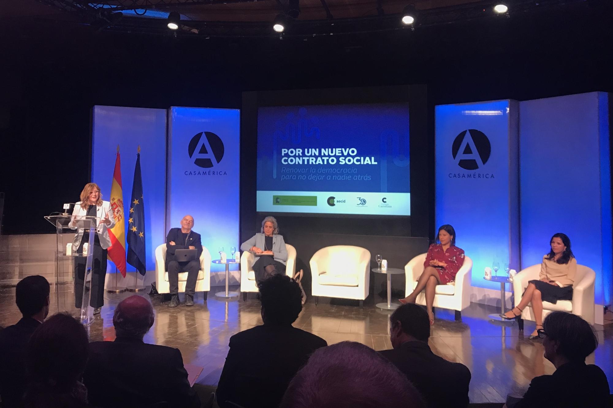 Nuestro Ministerio de Exteriores ha decidido poner su granito de arena para reconstruir un contrato social que no deje a nadie atrás, como reza el título, y esta es la primera sesión del programa que ha ideado. No sabemos a quién se ha encomendado ni qué hay más allá del placer de escuchar a tan autorizadas voces. La democracia nos preocupa solamente cuando el ruido de tantas tripas vacías se hace ensordecedor (durante la pandemia, apunta uno de los ponentes, un tercio de las familias latinoamericanas ha pasado al menos un día sin comer), y seguimos confiando en que un desarrollo sostenible, verde y amable, en manos de los de siempre, multiplicará panes y peces para acallarlo. Seguimos votando a favor de acuerdos de inversiones y tratados comerciales, como hace pocos días sucedió con Colombia, que reproducen ese sistema injusto con el que América Latina sigue desangrándose. Seguimos mirando hacia otro lado en lo que respecta la protección de activistas ambientales o sindicales. En estos días se negocia la nueva Ley de Empresa y Derechos Humanos, por cierto, una ocasión inigualable para limitar los abusos de las grandes empresas e inversiones con base en España, que puede quedar en otra capa de pintura verde si nos despistamos.