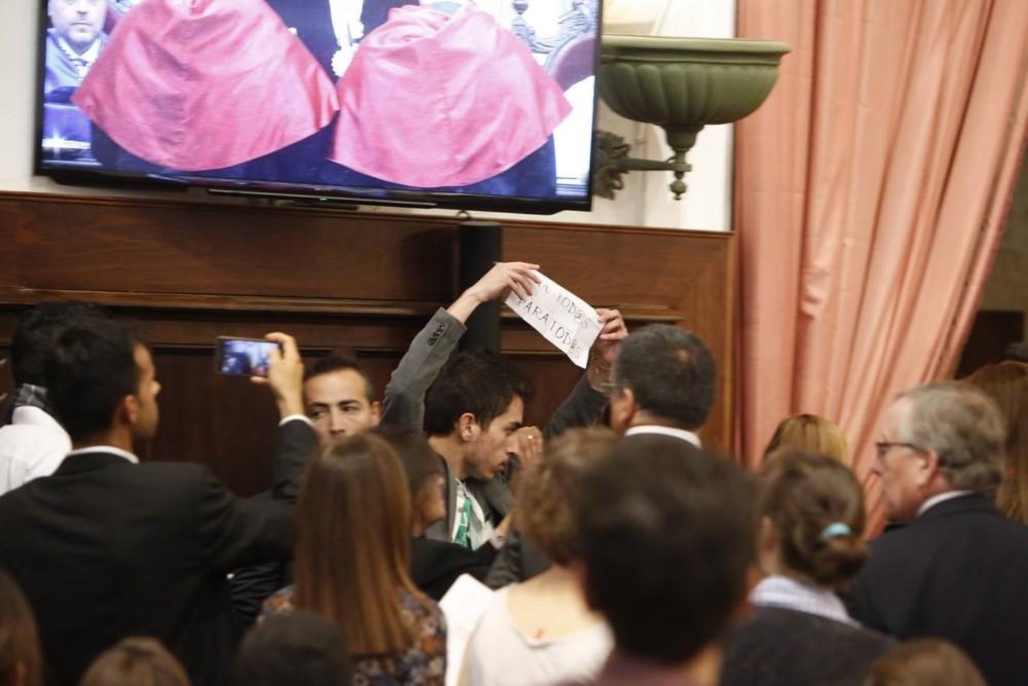 El acto de investidura del presidente de la Comisión Europea en la universidad tuvo lugar el 9 de noviembre de 2017. “Los cinco estábamos acreditados para asistir al evento y entramos de forma pacífica con carteles contra los recortes”, explica tras señalar que, cuando entraron al espacio donde se celebró el acto, nadie les cacheó.