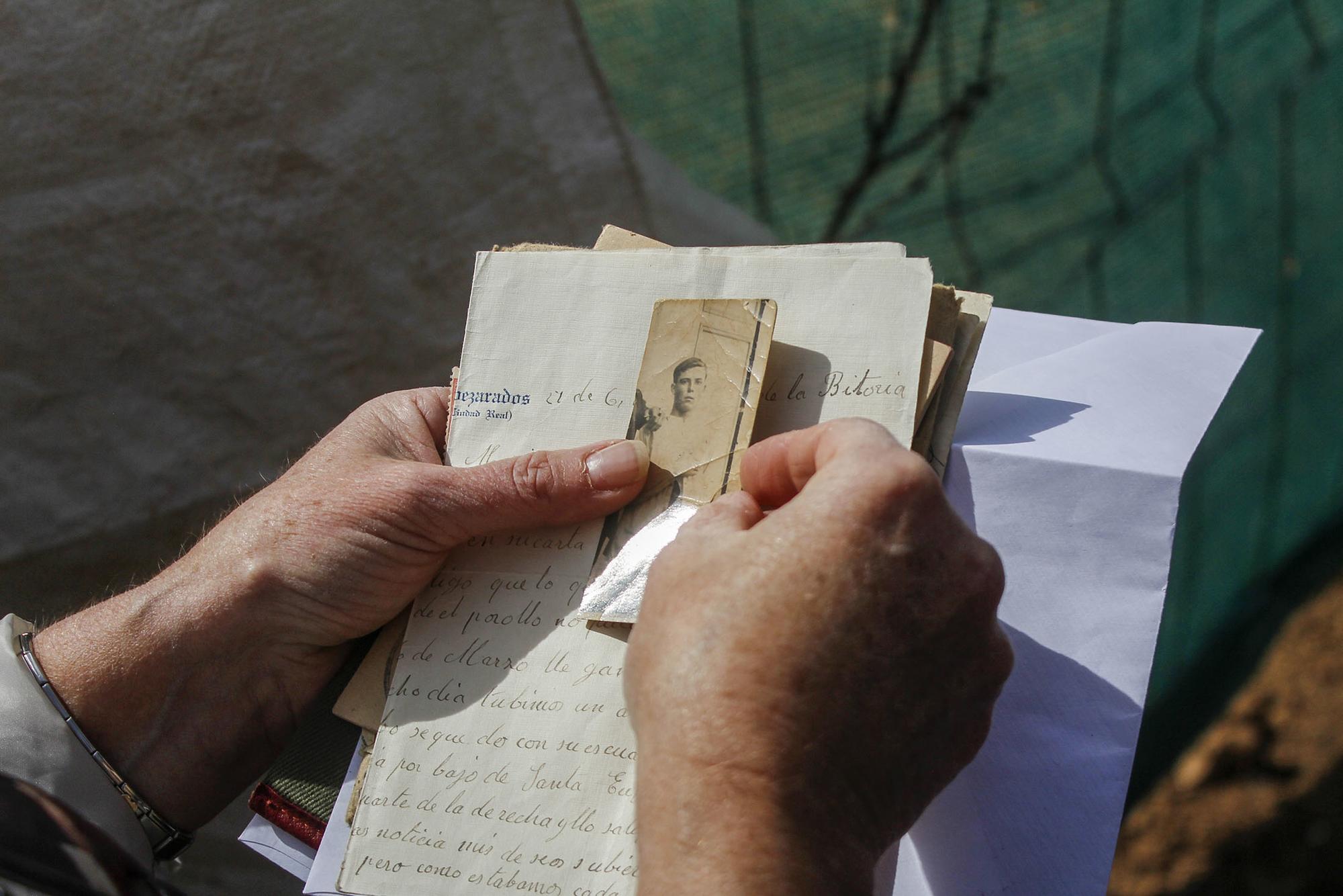 Con curiosidad y prudencia una mujer que lleva colgando dos fotos antiguas de un represaliado se asoma a ver los trabajos de exhumación. Es María Ángeles Ortega, de Sacedón, un pequeño municipio de Guadalajara. Lleva viniendo varios días seguidos esperando que aparezcan los restos de Romualdo Puerto Ibarra, el abuelo de su cuñado Ángel. “A mi abuelo también le fusilaron y le enterraron aquí, pero en otra fosa común, la número 21. Ahí debe haber unos 600 cuerpos más, y como hace años ampliaron el cementerio y metieron las máquinas, sus restos deben de estar en el osario”, se lamenta.