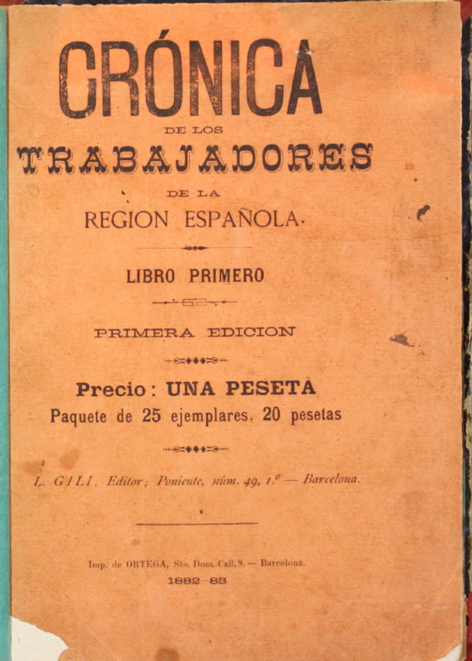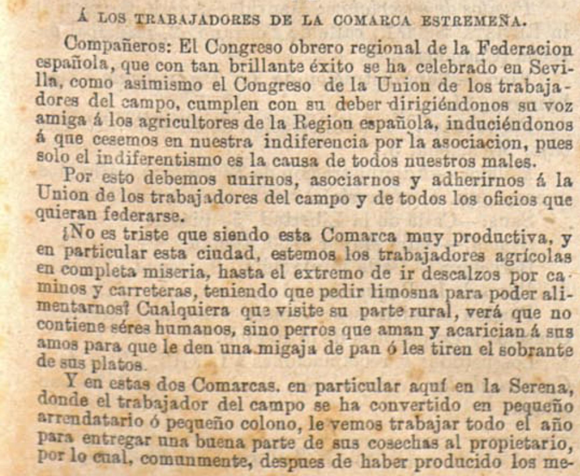 Compañeros: el Congreso obrero regional de la Federación española, que con tan brillante éxito se ha celebrado en Sevilla, como asimismo el Congreso de la Unión de los trabajadores del campo, cumplen con su deber dirigiéndonos su voz amiga a los agricultores de la Región española, induciéndonos a que cesemos en nuestra indiferencia por la asociación, pues solo el indiferentismo es la causa de todos nuestros males.