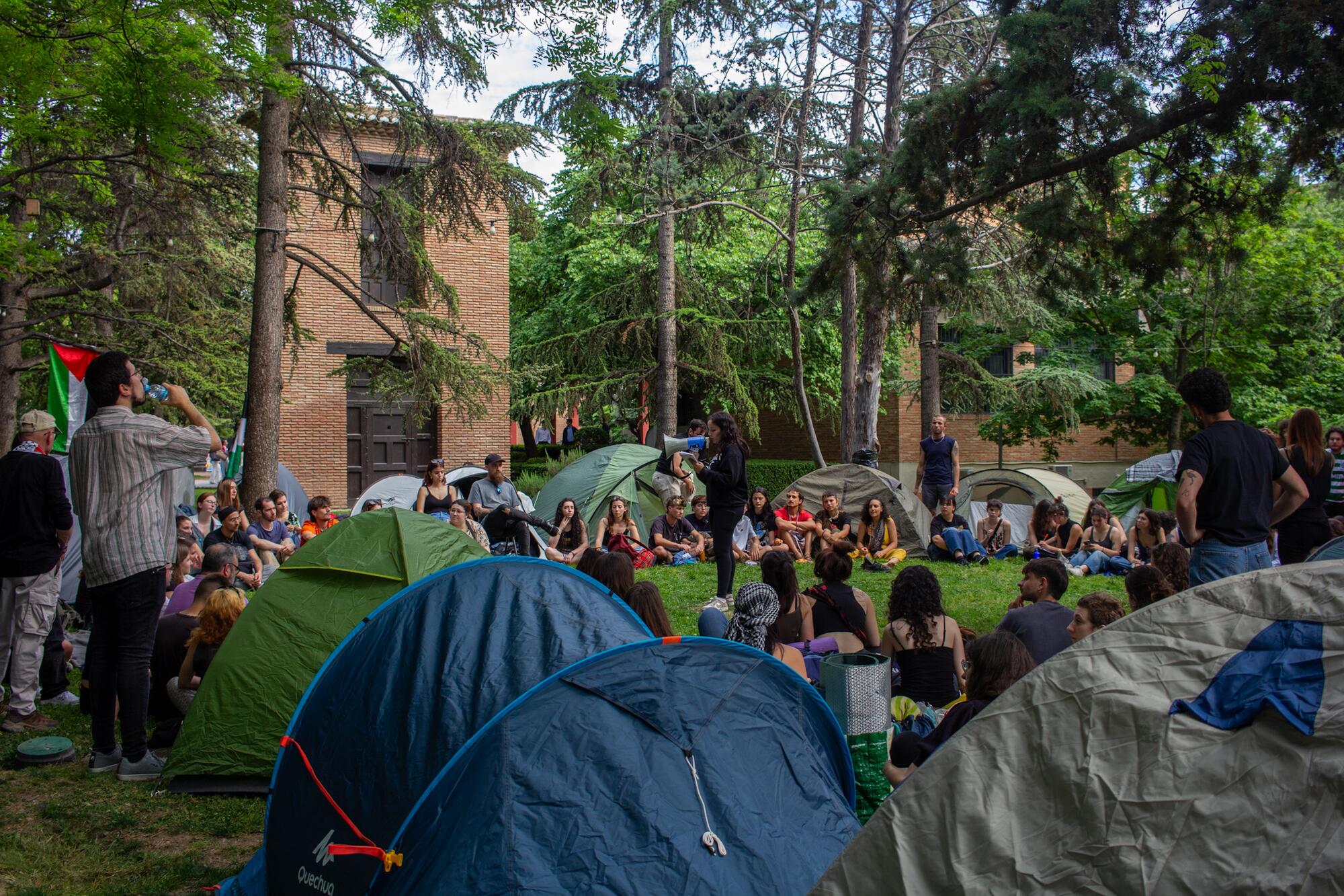 La acampada en Granada se une a la decena que se están realizando dentro del Estado español. En los próximos días, las estudiantes de la Universidad de Sevilla y Málaga pretenden unirse a la oleada de acampadas y de acciones contra el genocidio. En esta última, durante la mañana de miércoles se ha realizado una acción en los pasillos de la institución para exigir el fin del comercio de armas y de las relaciones con Israel del Estado español.