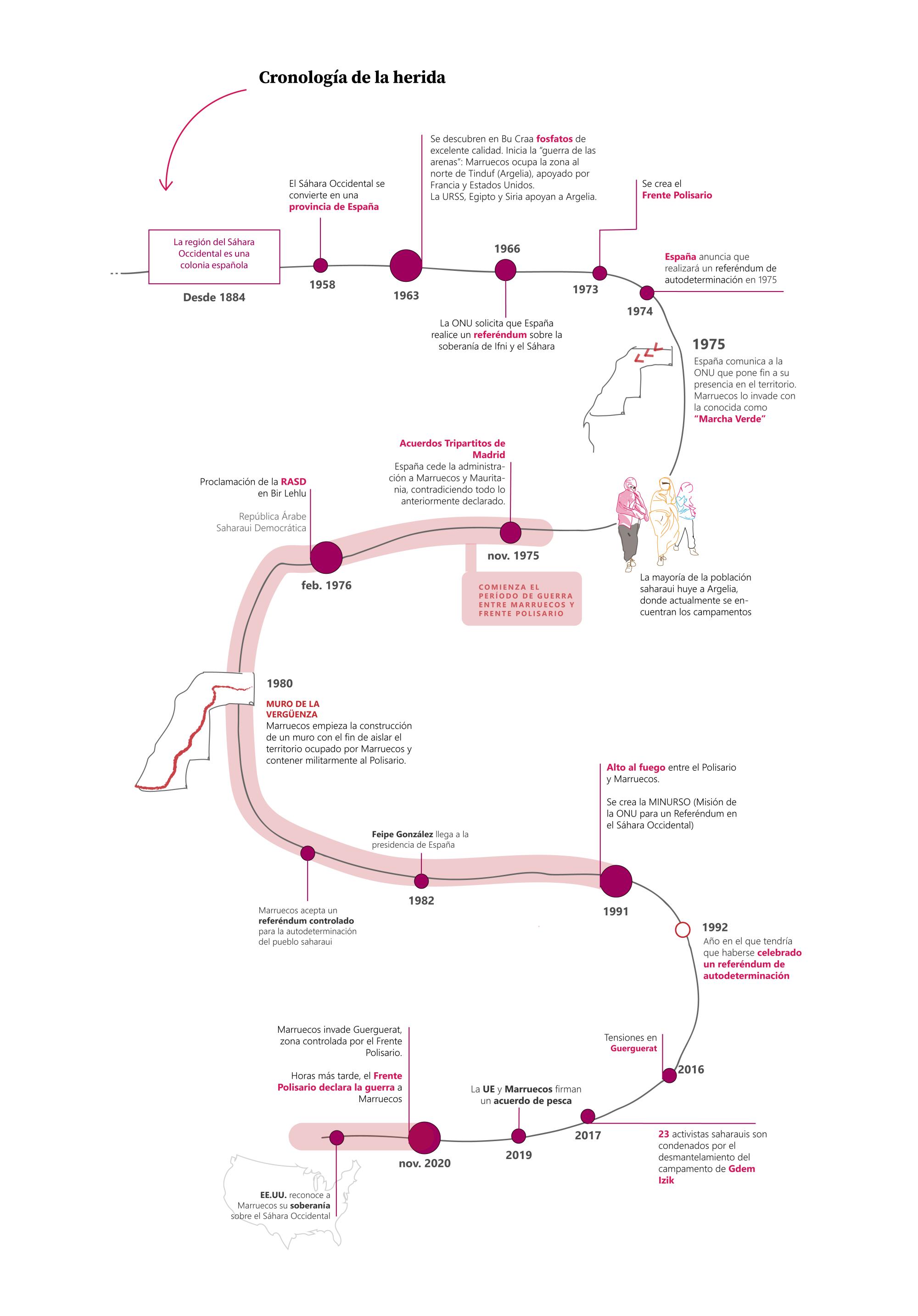 El Sáhara Occidental vive dividido por una herida longeva y profunda. El muro que lo divide, el tercero más extenso del mundo, es la viva imagen de ella. Entender un conflicto es una tarea compleja; para comprender el conflicto del Sáhara Occidental es importante no olvidar el papel que tuvo y que puede ejercer España. Y es que España es, a día de hoy, la potencia administradora del Sáhara Occidental —bajo el artículo 73 de la Carta de las Naciones Unidas— y una de las piezas clave para cerrar uno de los conflictos más largos de la historia reciente.