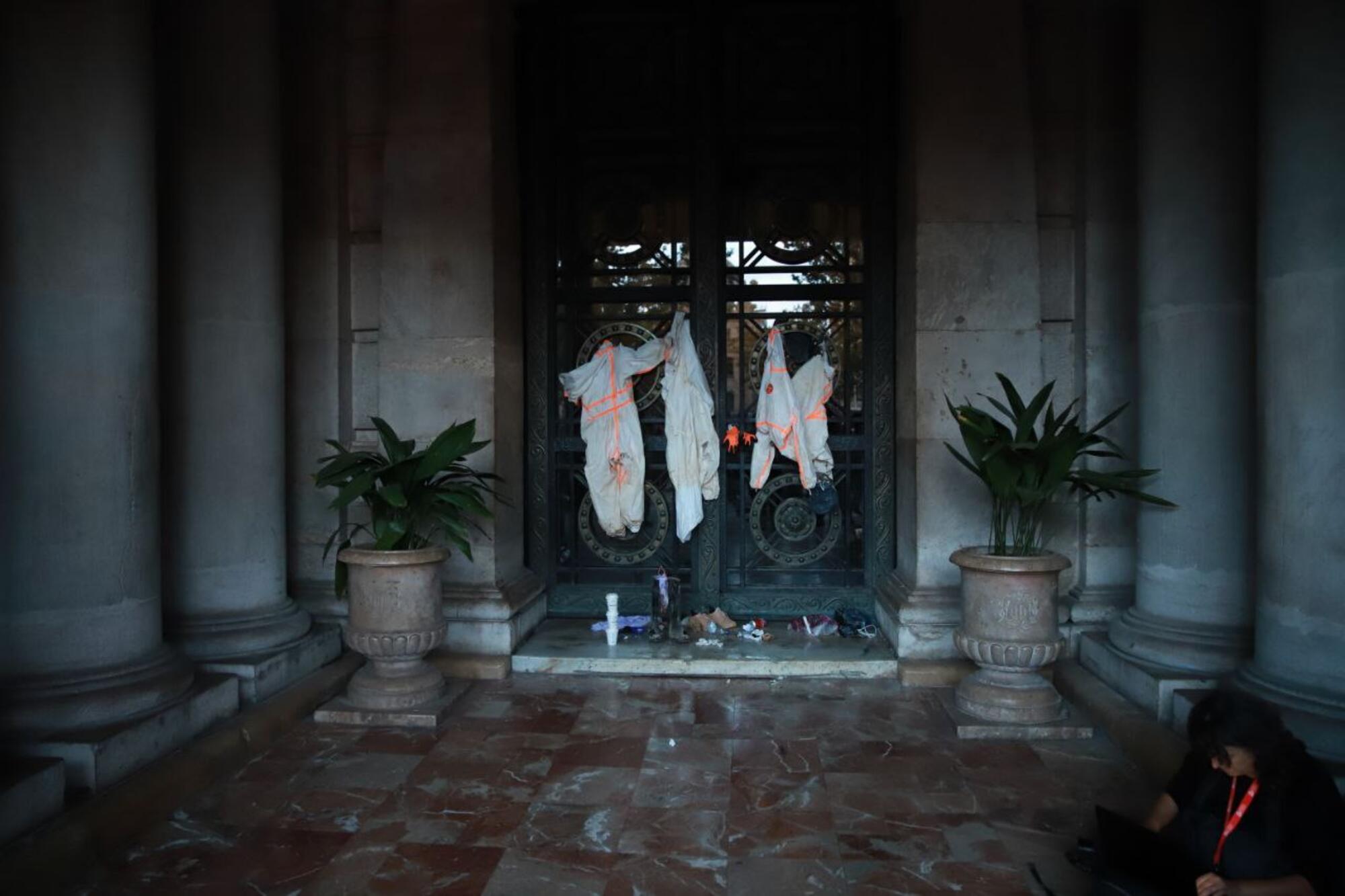 Algunos manifestantes han dejado las huellas de sus manos manchadas de barro en las paredes del Palau de la Generalitat en señal de protesta. La policía ha detenido a una persona durante esta acción y durante toda la convocatoria se han registrado, al menos, cuatro arrestos. Fuentes policiales exponen que la actuación de los efectivos de seguridad ha acabado con 30 agentes heridos.