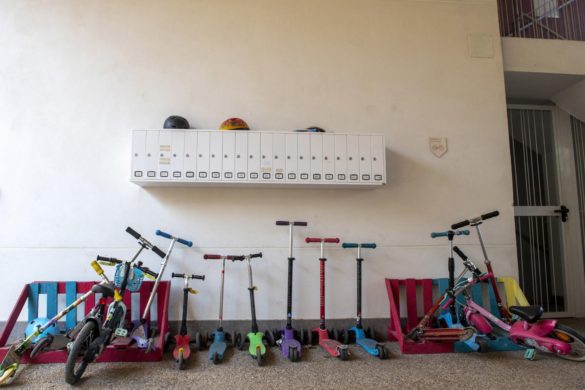 En la entrada, una docena de patinetes de todos los tamaños hace de antesala a un patio común en el que varias personas preparan platos con comida y bebidas para la fiesta de cumpleaños de uno de los niños de la comunidad. Junto al patio, una sala hace de zona de juegos infantil y de espacio para el reparto semanal de los alimentos —fruta, verduras, lácteos, pasta, pescado, carne y hasta café y cervezas— que cada semana llegan al grupo de consumo. “A mí me toca hacer reparto una vez cada tres meses”. Quien habla es Iñaki Alonso, vecino de Entrepatios y uno de los arquitectos que ha diseñado el edificio junto a sus socios de la empresa de arquitectura Satt.