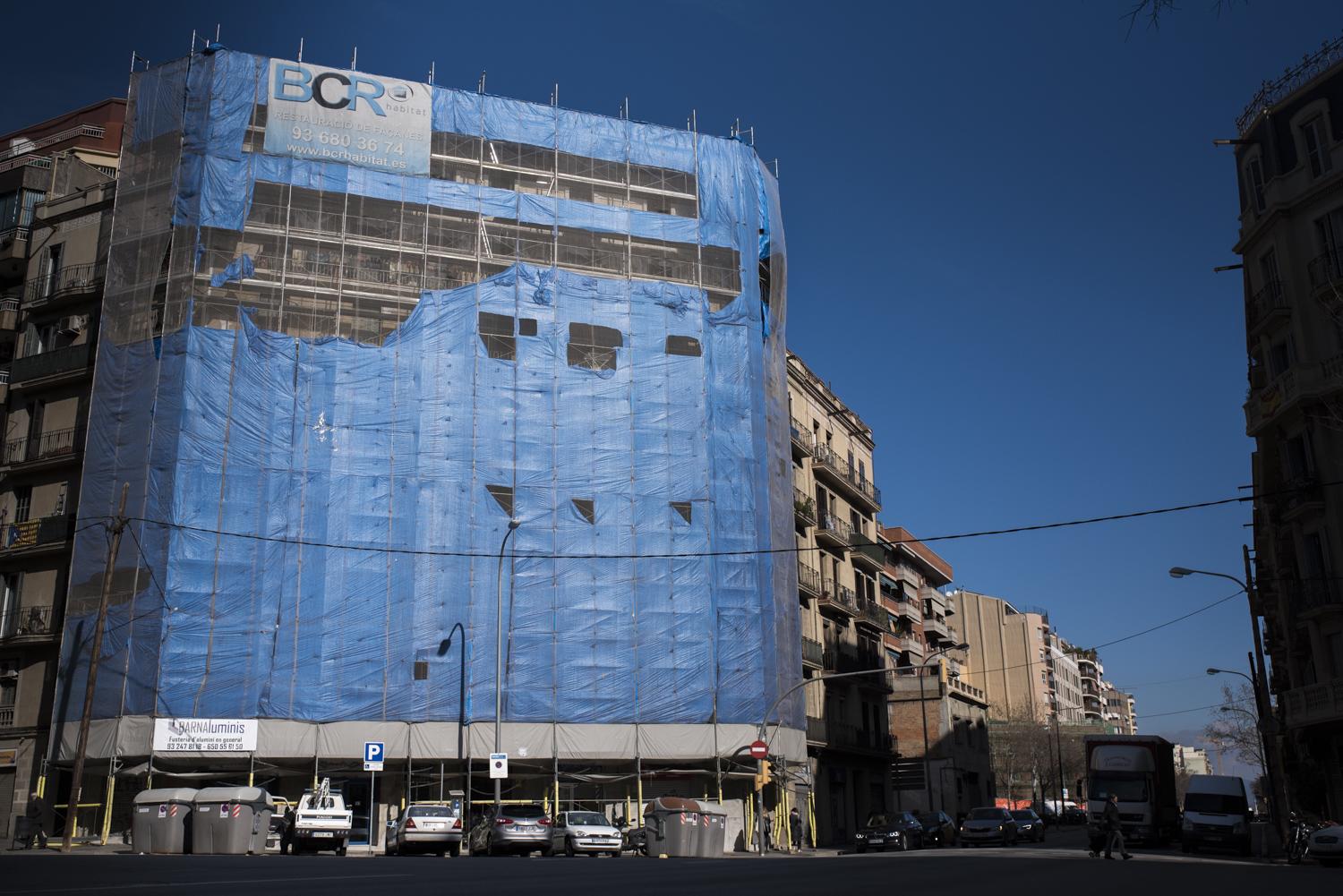 El edificio, en la calle Aragó de Barcelona, es visible a más de 500 metros. Una gran lona azul cubre toda la fachada y lo destaca sobre los demás inmuebles de la avenida. García tomó la decisión de ocupar en el edificio porque, asegura, la administración no le daba soluciones a un problema “que ellos generaron”.