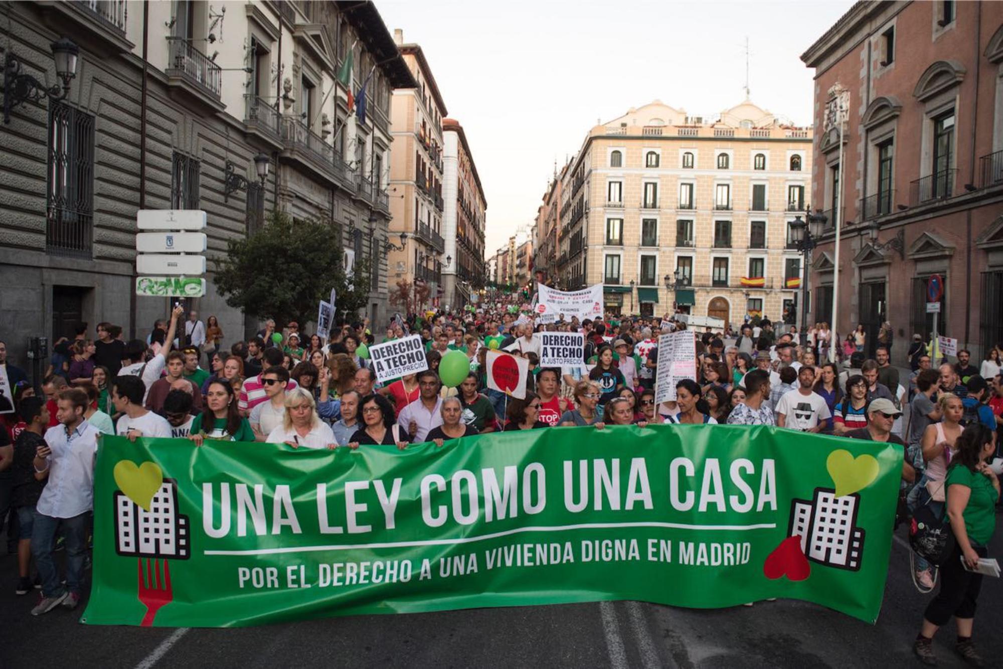 La protesta, que contó con el apoyo de decenas de colectivos entre los que se encontraban Amnistía Internacional, Ecologistas en Acción o los sindicatos CGT, CNT y de Inquilinas e Inquilinos de Madrid, fue convocada por los promotores de la ILP: la Coordinadora de Vivienda de Madrid —formada por la PAH y los grupos Stopdesahucios—, la Federación Regional de Asociaciones de Vecinos de Madrid (FRAVM) y la Asociación Libre de Abogados (ALA).El objetivo era "presionar a los partidos políticos y mostrar que hay un músculo social que demanda que la ILP se vote cuanto antes", tal como indicaba a El Salto la portavoz de la PAH, Alejandra Jacinto, la jornada anterior a la convocatoria.