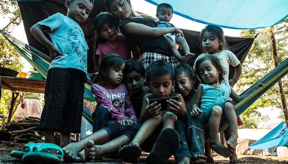 Los Patojos no asisten a la escuela, sus días transcurren caminando descalzos entre tiendas de campaña o refugios llanos; pescando mojarras en el mismo río donde se bañan y las mujeres lavan la ropa, del que acarrean y toman agua. Por lo general subsisten con lo que logran pescar y comiendo alimentos enlatados, pues, abandonada en Laguna Larga y sin autorización para ingresar, la siembra de la comunidad la dan por perdida. Pero en medio de la miseria Los Patojos se ríen, se entretienen con juegos de mesa y un teléfono móvil. Ahora dibujan sus viviendas —las que fueron sus hogares— tal como las recuerdan antes de que fueran destruidas. Sus padres son desplazados históricos: indígenas o campesinos despojados de sus tierras, líderes comunitarios amenazados de muerte, luchadores sociales acosados por el ejército, todos mezclados con alguno que otro kaibil en retiro.